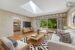 Formal living room beside the entry includes wood burning fireplace. Formal dining walks out to deck and back yard. Main level family room features wood floors and walk-out to back patio, yard, and garage entry. Skylights add natural light.